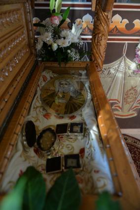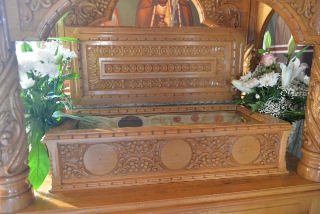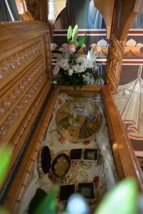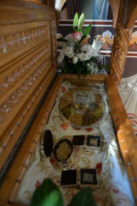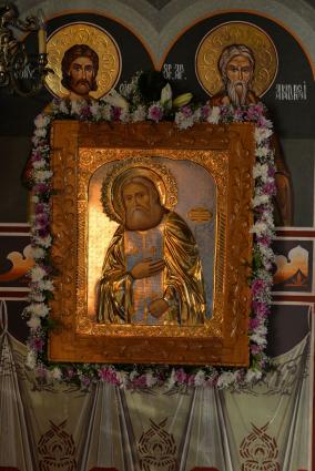 Pridvorul închis adăposteşte un baldachin pe care stă cutia cu o părtică din moaştele Sfântului Cuvios Serafim de Sarov.
