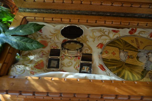 Pridvorul închis adăposteşte un baldachin pe care stă cutia cu o părtică din moaştele Sfântului Cuvios Serafim de Sarov, odor nepreţuit care îmbogăţeşte zestrea duhovnicească a mănăstirii. Moaştele au fost primite de la Mănăstirea „Sfântul Teodor Tiron” din Serbia, prin părintele Cleopa Stefanovici.